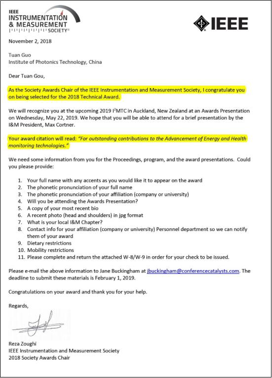 近日,我校光子技术研究院郭团教授收到国际IEEE仪器与测量学会(IEEE Instrumentation and Measurement Society,IMS)主席来信,祝贺他获得了2018年度该学会的科技奖(TECHNICAL Award),以表彰郭团教授在能源与健康监测领域做出的杰出贡献。郭团教授的获奖辞为“For outstanding contributions to the Advancement of Energy and Health monitoring technologies”。
