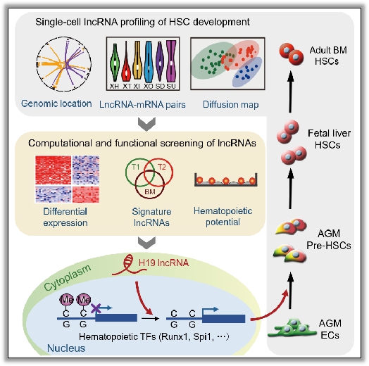 该项研究首次揭示了在HSC发生过程中发挥重要功能的lncRNA,并系统阐述了lncRNA-H19在胚胎HSC发生与成体HSC稳态维持中完全不同的功能以及调控方式。这些认识将为全面理解lncRNA调控重要生物学过程的机制提供重要启示,HSC发育全程的单细胞lncRNA图谱也将为HSC发育和再生机制研究提供重要的数据库和参考。
