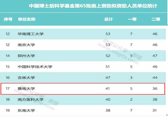 近日,中国博士后科学基金会公布了第65批面上项目拟资助人员名单,我校共有41名博士后研究人员获得资助,其中一等资助5人,二等资助36人,获批数位列全国第17位。相比之前我校最好排名(第21位),又取得进一步提升。