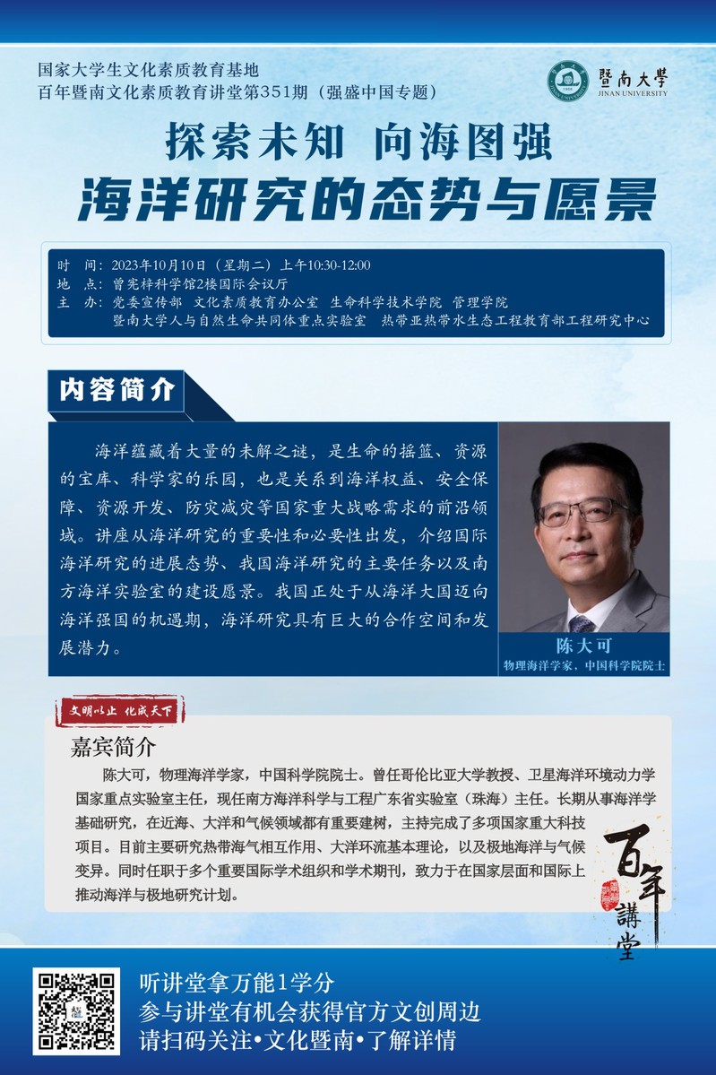 百年暨南文化素质教育讲堂第351期:陈大可:探索未知 向海图强——海洋研究的态势与愿景