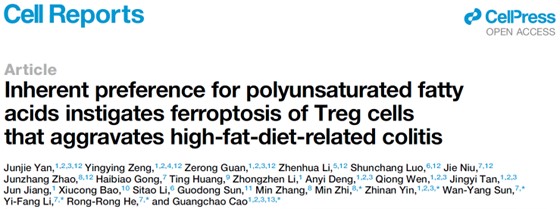 近年来的研究发现,HFD还会引起肠道组织Treg细胞(发挥免疫抑制功能的关键细胞之一)比例与数量的显著下调,是机体免疫抑制能力衰减的重要表现;但是HFD导致Treg细胞数量减少的原因尚未完全解析。2024年8月16日,我校生物医学转化研究院与药学院合作,在《Cell Reports》杂志发表了题为“Inherent preference for polyunsaturated fatty acids instigates ferroptosis of Treg cells that aggravates high fat diet related colitis”的研究论文。该研究发现,Treg细胞具有偏好使用多不饱和脂肪酸(polyunsaturated fatty acids,PUFAs)来合成细胞膜磷脂的固有属性,导致其细胞膜更容易被脂质过氧化,引发铁死亡,进而导致Treg细胞数量减少、免疫抑制功能降低。而西式饮食结构或HFD中含有高丰度的PUFAs(如花生四烯酸,arachidonic acid,AA),因此,大量脂质摄入引起Treg细胞铁死亡,进而导致免疫抑制功能下降,不能有效抑制肠炎。