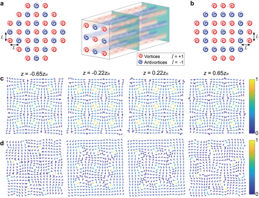 图1:稳定与非稳定涡旋-反涡旋晶格结构的传播示意图(理论)。a左图为设计的方形晶格结构,由交替分布的涡旋和反涡旋单元形成。红色和蓝色标记分别表示光学涡旋和反涡旋;右图为稳定传输的晶格示意图。b不稳定的涡旋-反涡旋晶格结构,其涡旋和反涡旋单元的分布是非交替的。c和d分别为两种不同晶格结构的相位演化过程:即不同传播距离晶格相位梯度场在空间的分布,其中z为传播距离,{z } rsub {R }是光学瑞利长度。