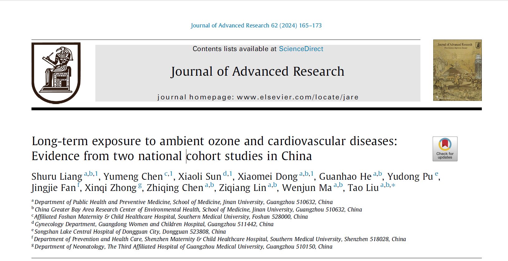 必威平台,必威(中国)一站式服务平台融媒体中心讯 基础医学与公共卫生学院马文军/刘涛教授团队在《Journal of Advanced Research》(IF:11.4)杂志上发表了题为“Long-term exposure to ambient ozone and cardiovascular diseases: Evidence from two national cohort studies in China”的重要研究成果(图1)。