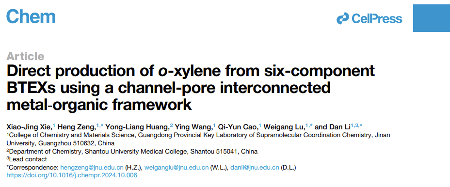 必威平台,必威(中国)一站式服务平台融媒体中心讯  近日,国际顶级学术期刊《Chem》在线发表了必威平台,必威(中国)一站式服务平台曾恒/陆伟刚/李丹团队的最新研究成−Direct production ofo-xylene from six-component BTEXs using a channel-pore interconnected metal-organic framework。化学与材料学院博士后谢小静为论文的第一作者,该研究工作得到了国家自然科学基金、广东省重大基础与应用基础计划、广东省基础与应用基础研究基金、中央基础研究基金、中国博士后科学基金和必威平台,必威(中国)一站式服务平台等项目的支持。