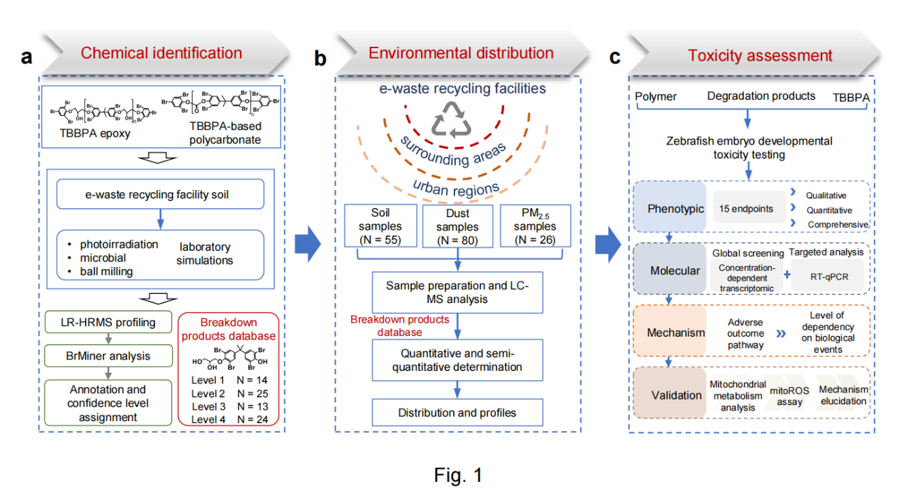 针对此问题,团队成员建立了分解产物非靶向识别、实验室模拟降解、实际环境调查及毒性评估的综合研究策略(图1),发现polyTBBPAs在环境中会分解成更小的产物。通过BrMiner非靶向筛选策略,识别出76种分子量在400-2000 Da之间的分解产物,这些产物在中国的电子垃圾回收设施及其周围的典型环境样本中被广泛检出。基于斑马鱼胚胎毒性测试显示,polyTBBPAs分解后毒性增加,线粒体功能障碍是关键毒性机制。结果表明聚合物阻燃剂对环境和人类健康构成潜在风险,应充分评估和规范其使用。