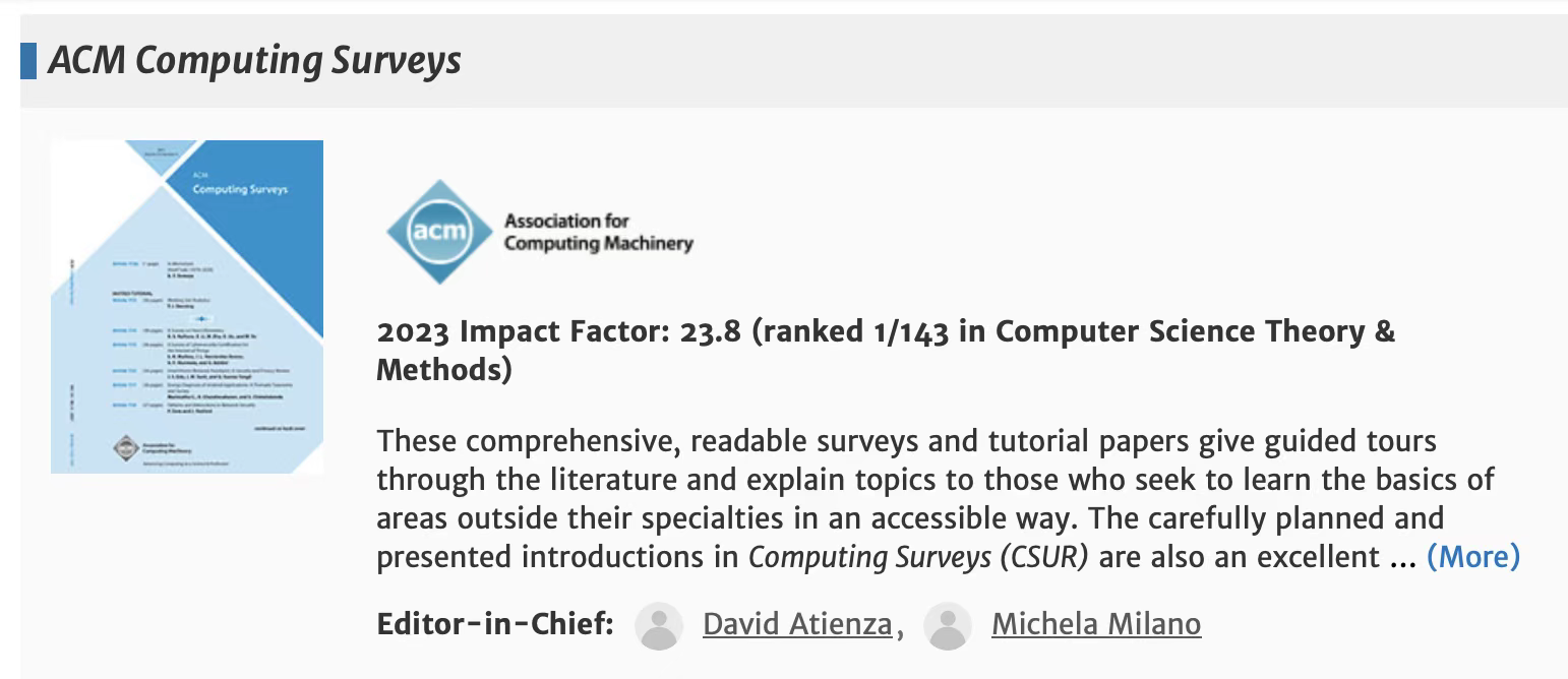 ACM Computing Surveys是美国计算机协会(ACM)旗下的期刊之一,是计算机科学、人工智能、软件工程等领域的重要综述类期刊,主要收录计算机各分支领域的重要研究进展、技术综述和文献总结,致力于为科研人员和工程技术人员提供权威、系统、前沿的知识参考。该期刊的最新SCI影响因子为23.8(2023年数据,在Computer Science Theory & Methods领域排名第1/143),中科院一区TOP期刊,JCR分区Q1。