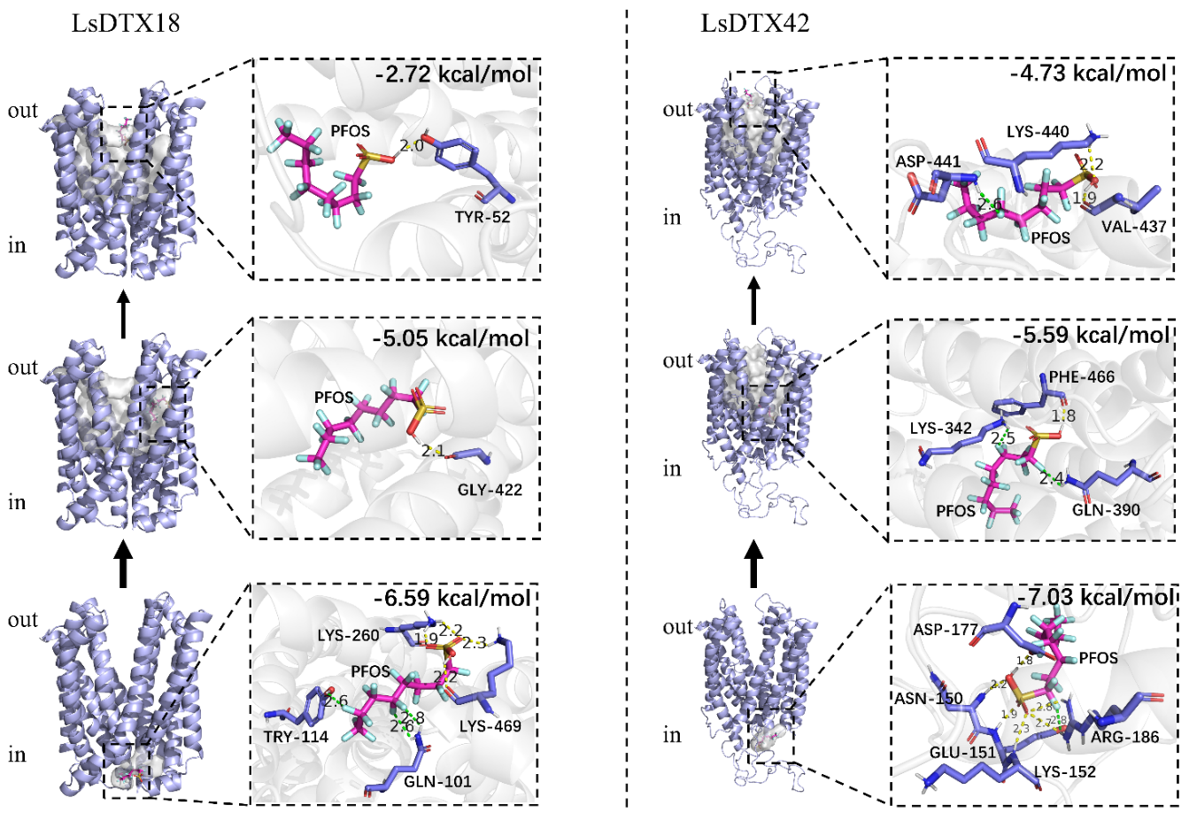 图 4.PFOS与LsDTX18和LsDTX42蛋白活性口袋的法分子对接。灰色表面表示LsDTXs的潜在活性口袋。黄色和绿色虚线分别表示PFOS与结合残基之间的氢键和卤键。