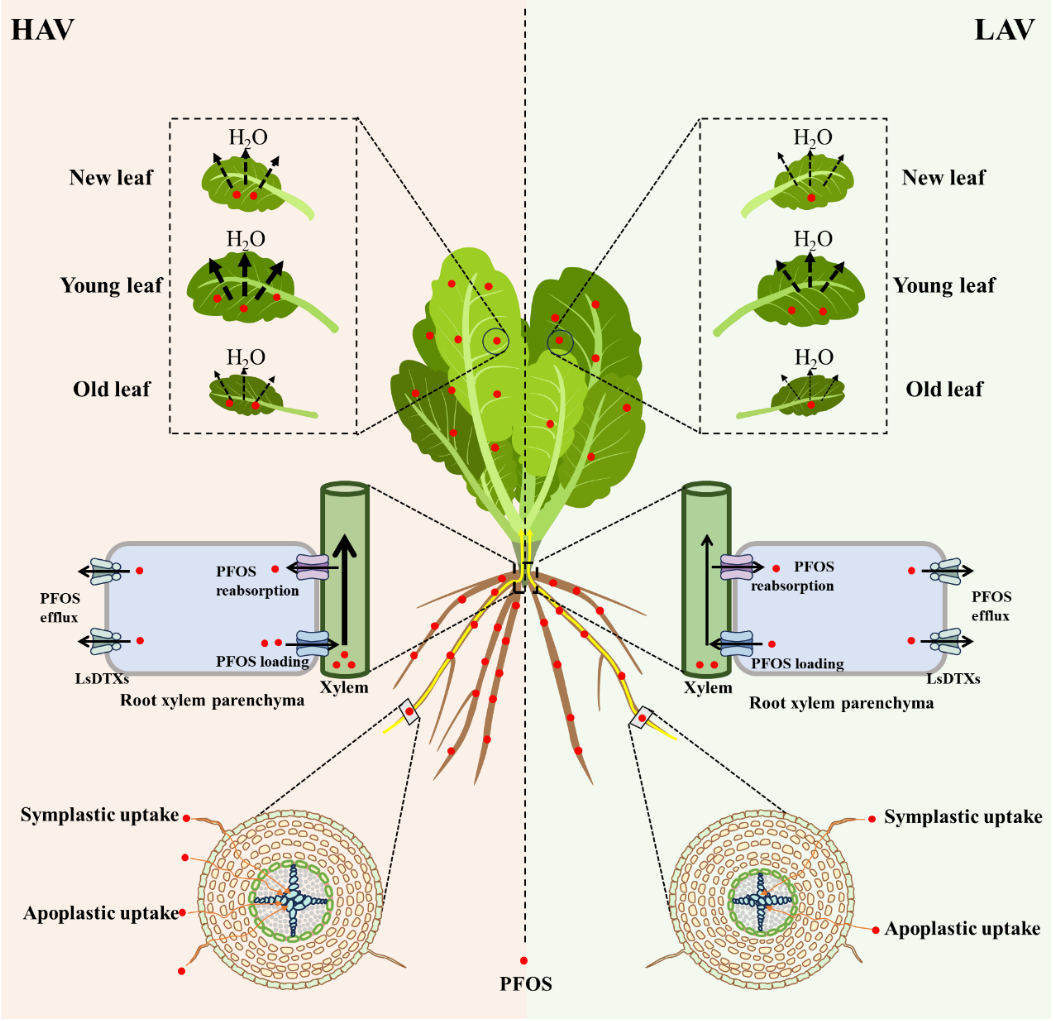 为此,该研究以筛选获得的PFOS低累积生菜品种(LAV)为研究对象,以PFOS高累积生菜品种(HAV)为对照,从根系解剖结构特征、PFOS在共质体和质外体的吸收转运特性、蒸腾作用以及关键解毒外排体基因(LsDTX18和LsDTX42)等方面,系统探讨了生菜不同品种吸收积累PFOS的差异及作用机制,并基于此提出了培育PFOS低积累作物品种的新策略。
