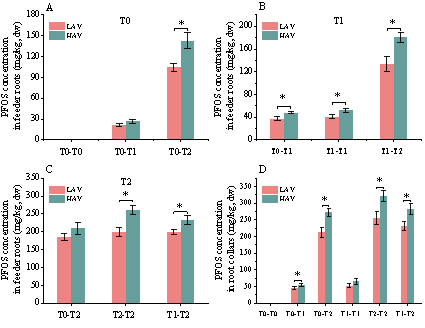 图2.分根实验中两种生菜的侧根和根颈中PFOS的浓度。T0、T1和T2分别表示表对照、0.2和 1.0 mg/L PFOS暴露条件。