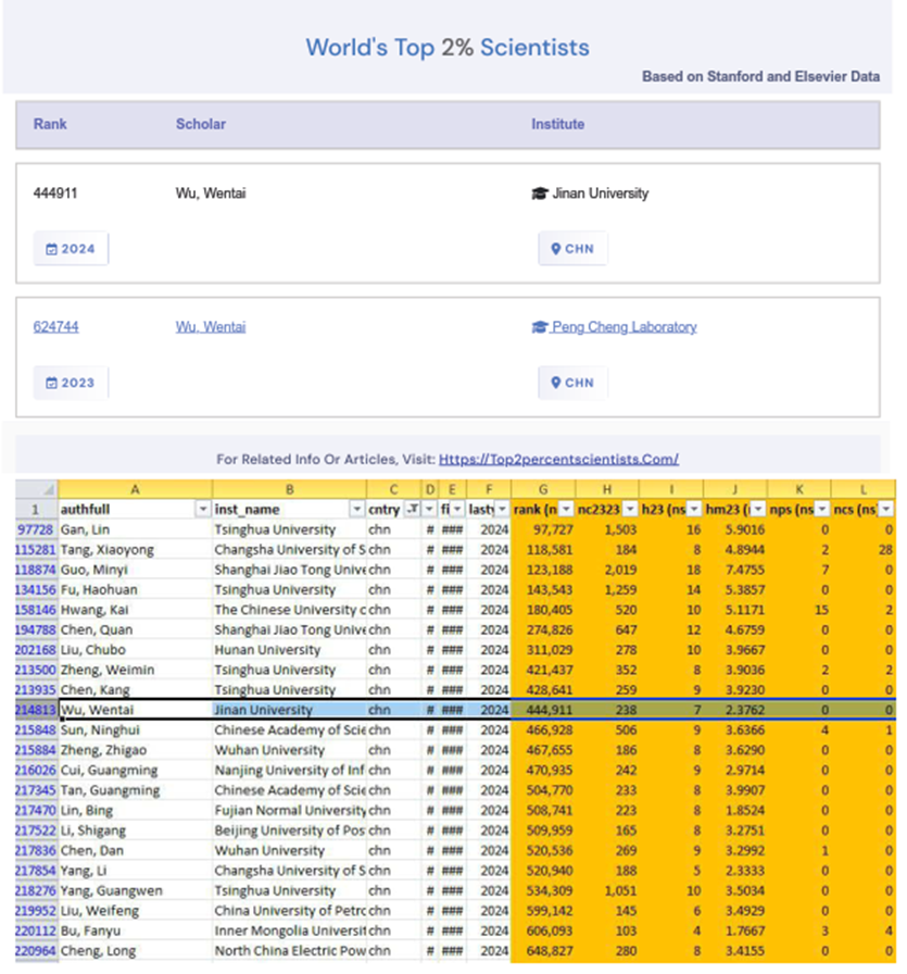 图 我院青年教师吴文泰(Wu, Wentai)连续两年入选top 2% scientists榜单,且分布式计算领域内最新年度排名为中国籍第10